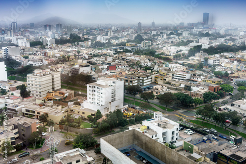 photo, outdoors, no people, architecture, building exterior, built structure, city, city life, aerial view, house, residential area, car, transportation, land vehicle, travel, clear sky, city landscape, skyscraper, day, horizontal, travel destination, urban scene, road, peru, lima, crowded