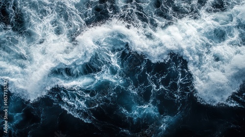 Aerial view of crashing waves in a deep blue ocean showcasing turbulent waters