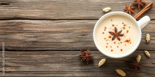 aerial, view, creamy, masala, tea, white, cup, star, anise, cinnamon, rustic, wooden, background, negative, space, text, beverage, drink, cosy, warm, spice, herbal, chai, aromatic, infusion, table, arrangement, comfort, food, colours, brew, natural, ingredient, organic, hot, authentic, culinary, culture, tradition, festive, serving, home, relaxation, still life, photo, simplicity, style, decoration