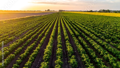field, aerial, sunset, crop, farmland, agriculture, row, plant, green, yellow, landscape, horizon, sunlight, vibrant, nature, summer, cultivated, pattern, line, growth, farm, parallel, dirtied, texture, gold, sky, cloud, wide, open, rural, farming, colours, beauty, fresh, lush, detailed, organic, productive, cultivation, uniform, orderly
