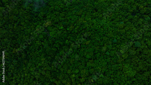 aerial view of dark green forest Abundant natural ecosystems of rainforest. Concept of nature forest preservation and reforestation.