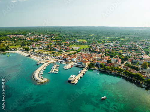Aerial view of Fazana, a small town with a small harbour along the Adriatic Sea coastline, Istria, Croatia.