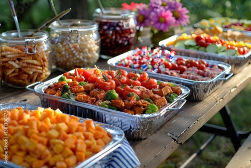 Aerial view of Fourth of July BBQ feast on outdoor table.