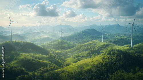 Aerial view of green hills and mountains with wind turbines under a bright sky, symbolizing renewable energy