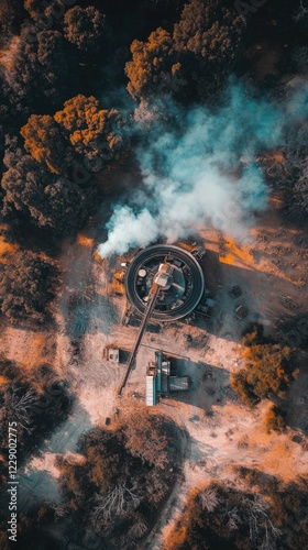 Aerial View of Industrial Machinery Amidst Trees and Smoke.