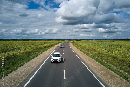 Aerial view of intercity road between green agricultural fields with fast driving cars. Top view from drone of highway traffic