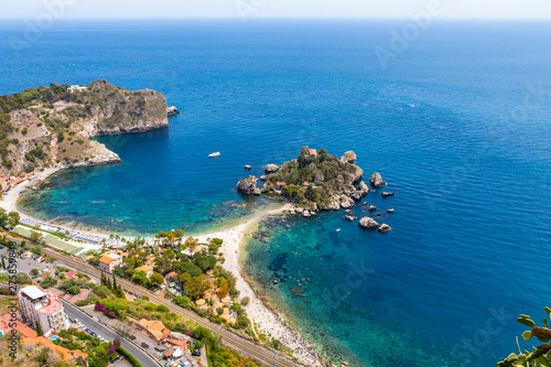 Aerial view of Isola Bella island and beach in Taormina, Sicily, Italy. Giardini-Naxos bay, Ionian sea coast. Isola Bella (Sicilian: Isula Bedda) also known as The Pearl of the Ionian Sea