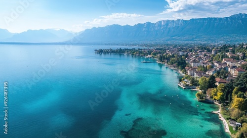 Aerial view of Lake Geneva, with its clear blue waters surrounded by picturesque towns and the towering Alps in the distance.