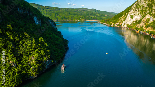 Aerial view of Lake Perućac in Tara National Park, Serbia. Stunning emerald waters, houseboats lined along the shoreline, and lush forested hills create a peaceful and scenic mountain escape
