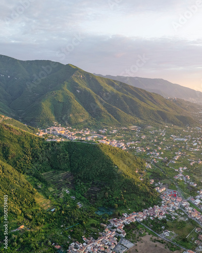 Aerial view of lush forest and small village nestled in the mountain valley at sunset, Campania, Italy.