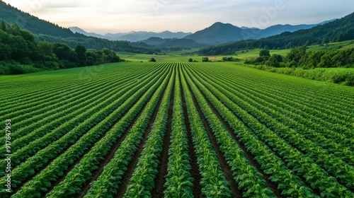 Aerial view of lush green fields with rows of crops under a scenic sky and mountains, showcasing nature's beauty and agriculture.