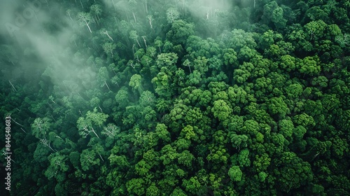 Aerial view of lush green forest with mist in the air, showcasing dense foliage and natural beauty. Perfect for nature and environmental projects.