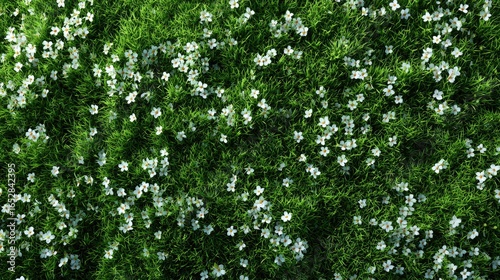 Aerial view of lush green grass with small white flowers, perfect for an outdoor setting