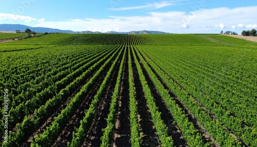 Aerial View of Lush Green Vineyard Rows under a Sunny Sky
