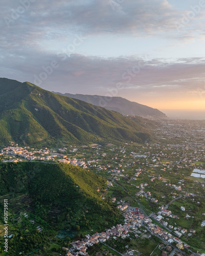 Aerial view of lush mountain village with sunset sky and smoke, Campania, Italy.