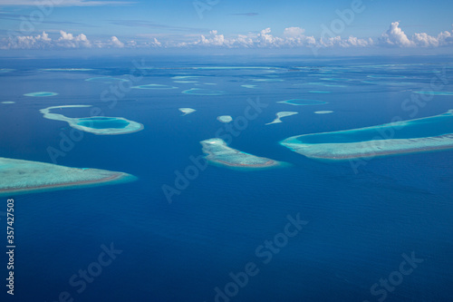 Aerial view of Maldives atolls is the world top beauty. Maldives tourism. Luxury travel destination, amazing nature environment, islands atoll and coral reef. Tropical landscape, aerial view