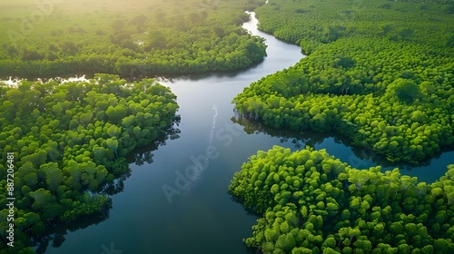 aerial, view, mangrove, forest, gambia, tree, water, ecosystem, nature, landscape, coastal, environment
