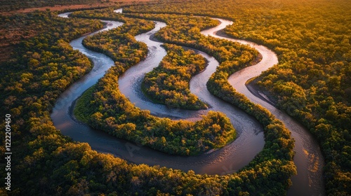 Aerial view of meandering river in sunset, lush forest background, nature travel