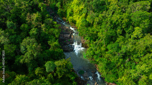 Aerial view of mixed forest, deciduous trees, greenery and waterfalls flowing through the forest. The rich natural ecosystem of rainforest concept is all about conservation and natural reforestation