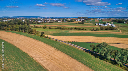 Aerial View of Multiple Farms and Train Tracks going Thru Them on a Beautiful Summer Day