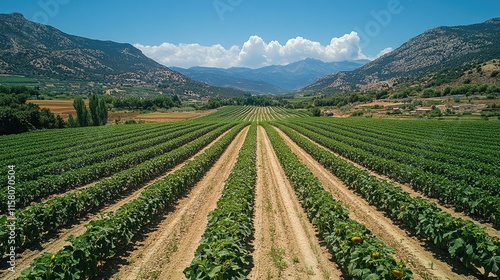 agriculture, farming, field, crop, row, plant, landscape, rural, nature, scenery, sun, sky, mountain, hill, vale, green, growth, cultivation, harvest, summer, day, environment, dirtied, land, plantation, farm, countryside, scenic, vista, view, aerial, drone, image, photo, picture, background, texture, pattern, expanse, immensity, horizon, distance