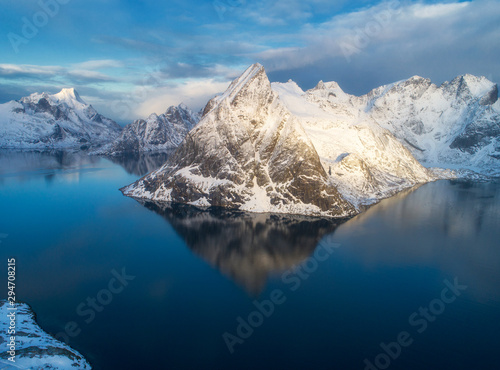 Aerial view of Olstinden mountain at sunrise in winter