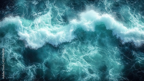 Aerial view of powerful ocean waves, turquoise water with white foam. Perfect for travel, nature, or environmental projects.