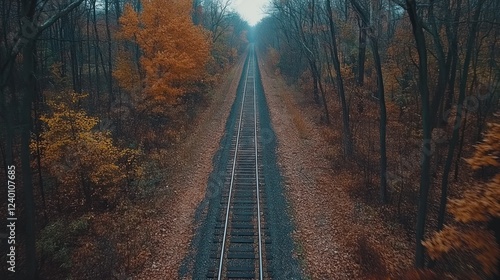 railway, track, railroad, forest, autumn, fall, tree, leaf, wood, nature, landscape, aerial, view, overhead, top, scene, path, way, road, travel, journey, season, colours, orange, red, brown, yellow, green, fog, mist, atmosphere, sky, dark, light, day, cold, winter, quiet, calm, peaceful, tranquil, alone, solitary, empty, remote, distant, perspective, line, straight
