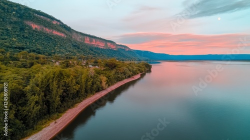 river, sunset, aerial view, landscape, nature, water, sky, pink, orange, green, foliage, rock, shoreline, calm, peaceful, serene, evening, twilight, horizon, cloud, tree, vegetation, panorama, scenic, view, beautiful, summer, travel, photo, drone, birds eye view, natural, environment, light, colours, texture, composition, image