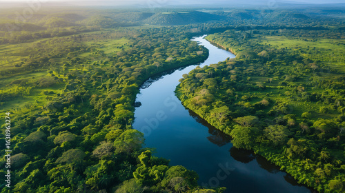 Aerial View of River in Casanare, Colombia. Stunning aerial view of a winding river surrounded by lush green vegetation in Casanare, Colombia. Perfect for nature lovers and travel enthusiasts