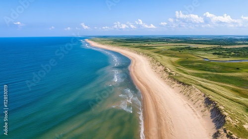 beach, sand, ocean, sea, water, wave, sky, cloud, dune, grass, green, land, aerial, view, coastal, shoreline, landscape, nature, summer, sunlight, horizon, blue, turquoise, calm, wind, scenic, beautiful, picturesque, tranquil, serene, peaceful, idylli, huge, expanse, remote, untouched, wild, coast, coastline, countryside, meadow, field