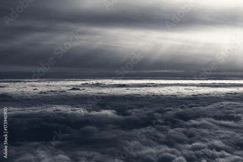 dramatic sky, cloudscape, sky, aerial view, sea, overcast, grey, sunbeam, light effect, flying, idylli, awe, storm, storm cloud, monochrome, majestic, intricacy, no people, up high, up high, horizon, horizontal, nature, natural pattern, tranquil scene, calmness, sunlight, climate, grey background, beam of light, freshness, purity, white color, copy space, landscape