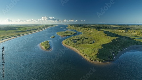 river, landscape, aerial, view, nature, water, sky, green, coast, land, blue, summer, day, panorama, seascape, shore, island, beach, sand, hill, grass, cloud, sun, light, horizon, ocean, scenic, beautiful, calm, serene, tranquil, peaceful, wild, remote, rural, natural, environment, vista, photo, drone