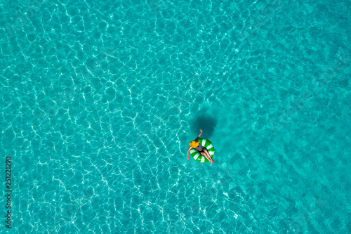 Aerial view of slim woman swimming on the swim ring donut in the transparent turquoise sea in Seychelles. Summer seascape with girl, beautiful waves, colorful water. Top view from drone