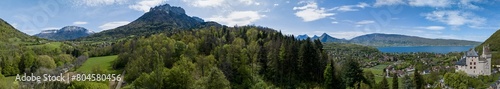 Aerial view of the Chateau de Menthon is a medieval castle located in the commune of Menthon-Saint-Bernard. From its raised position, the castle stands out over Lake Annecy and the mountains. France