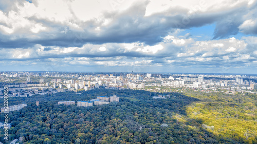 Aerial view of the city. Show of autumn foliage around the fields and forest