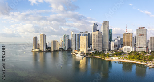 Aerial view of the gleaming Miami skyline, a symphony of modern architecture reflected in the tranquil bay waters, bathed in the soft hues of the morning light, Miami, Florida, United States.
