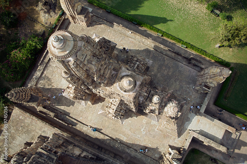up high, aerial, ancient, architecture, building, carving, daytime, drone, exterior, heritage, historical, india, khajuraho, landmark, outdoors, religious, sacred, sculpture, site, church steeple, stone, structure, sunny, temple, tour tourism, tourist attraction, travel, view
