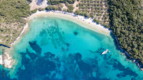 Aerial view of the sailboat on blue sea, empty white sandy beach, umbrellas at sunset. Summer in Greece. Tropical scenery with boat, ocean with waves, green palms, sky. Top drone view. Exotic