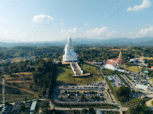 Aerial view of the towering white Guan Yin statue stands majestically against a backdrop of lush greenery and distant mountains, Guan Yin Statue, Chang Wat Chiang Rai, Thailand.