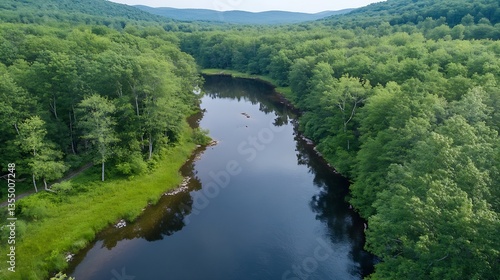 Aerial view of tranquil river flowing through lush green forest landscape with hills in the background : Generative AI
