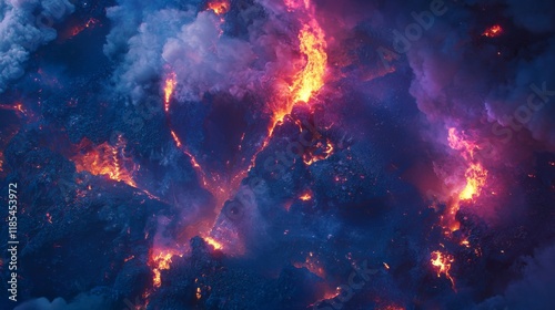 volcano, eruption, lava, fire, smoke, aerial, night, volcanic, texture, heat, hot, fiery, plume, flow, rock, dark, night sky, dramatic, intense, energy, power, nature, geology, landscape, geography, magma, incandescent, disaster, natural disaster, extinction