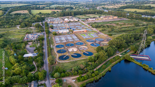 Aerial view of water treatment plant, surrounded by river, nature and farming fields