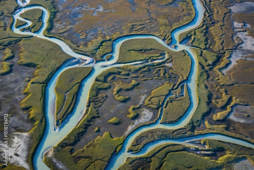 Aerial view of winding river channels flowing through green marshlands with muddy and grassy textures creating a natural waterway network