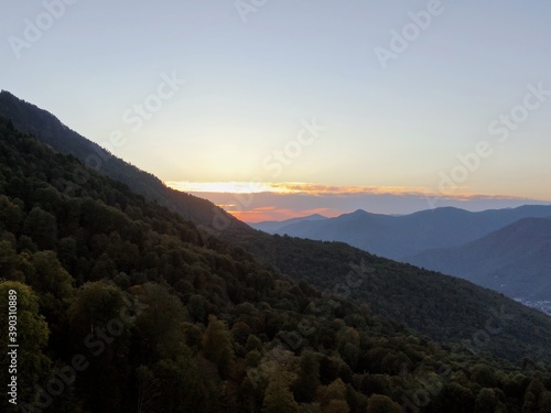 Aerial view panorama of sunset between mountains against the background of a blue sky. Beautiful sunset landscape in the mountains