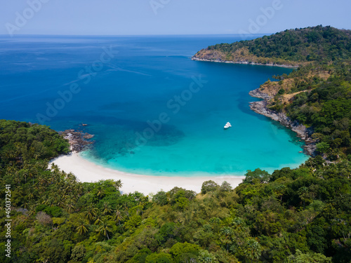 Aerial view tropical beach and sea Top down view of drone. Andaman sea Phuket Thailand.