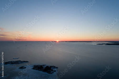 Aerial winter photo of sunsetting at Finnish archipelago, Baltic Sea