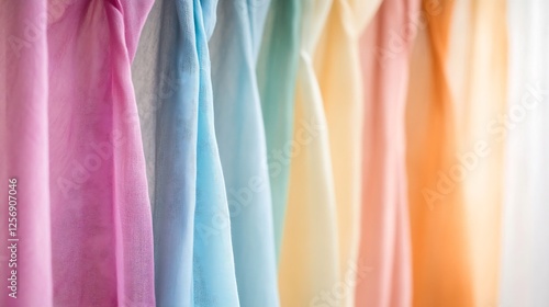 Aesthetic arrangement of colorful sheer curtains hanging in a bright room with soft light : Generative AI