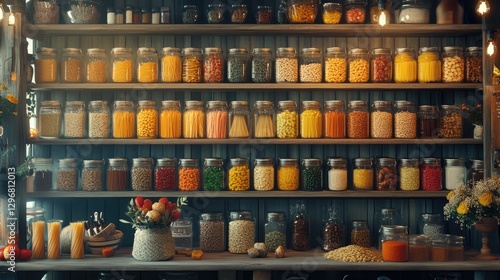 Aesthetic glass jars filled with kitchen essentials like pasta, rice, and spices, neatly arranged on shelves.