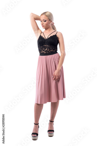 sad, emotion, woman, young, beautiful, isolated, trendy, stylish, fashion, full body, people, white background, blond, style, clothes, hair, skirt, pink, attractive, full-length, portrait, modern, lifestyle, femininity, elegance, youth, caucasian, platform, lace, fashionable, pretty, female, high heel, standing, posing, casual attire, looking down, glamour, luxury, well-dressed, ponytail, coiffure, feeling, relaxation, fresh, sensual, delicate, lady